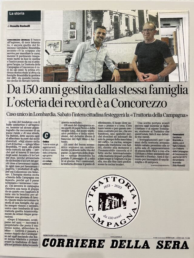 150 anni fa apriva per la prima volta quella che ancora oggi conoscete come “Trattoria Campagna da Pierino”. Quello che ci distingue è l’amore per la tradizione che ci è stato tramandato da Gerolamo, passando per Mariétt e Pièren fino ad arrivare a Mino, il nostro titolare. Se siete amanti della tradizione e di una calorosa accoglienza, saremo felici di accogliervi nella nostra piccola grande famiglia per farvi assaporare i pilastri della cucina lombarda e molto altro ancora.